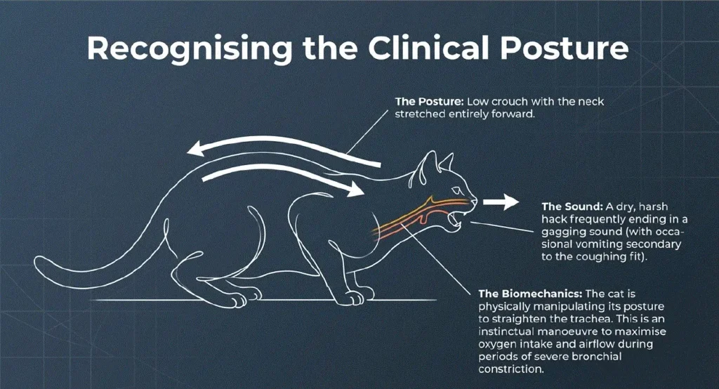 Some cats also crouch low to the ground with their neck extended while coughing, which is a typical posture seen during respiratory distress.