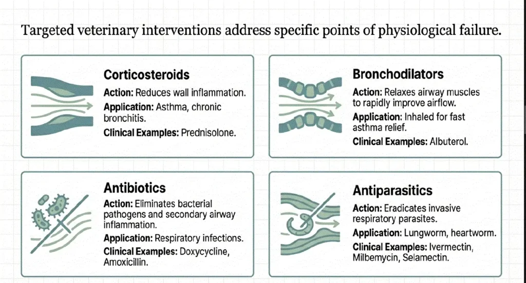 When bacterial infections are responsible for coughing, veterinarians prescribe antibiotics such as doxycycline or amoxicillin. These medications eliminate bacteria causing respiratory infections and reduce inflammation in the airways.