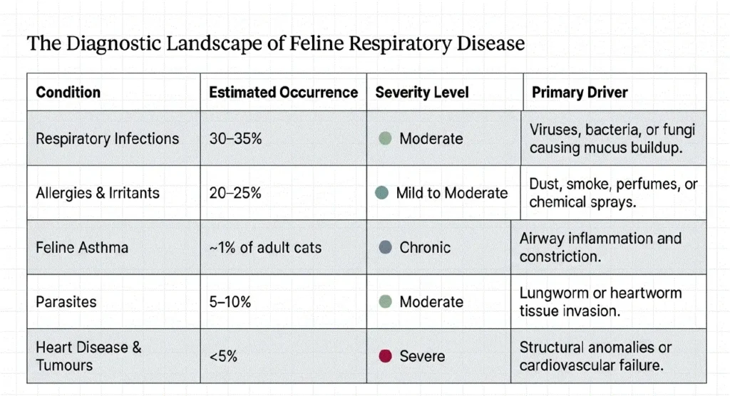 Veterinary reports show that respiratory infections, feline asthma, bronchitis, allergies, and parasites are among the most common causes of coughing in cats. Identifying the root cause is the most important step before giving any medication.