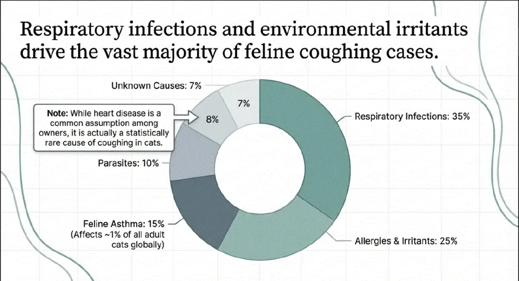 Veterinary research suggests that respiratory infections account for a large percentage of coughing cases in cats. Feline asthma is another important condition that causes chronic coughing and breathing difficulty.