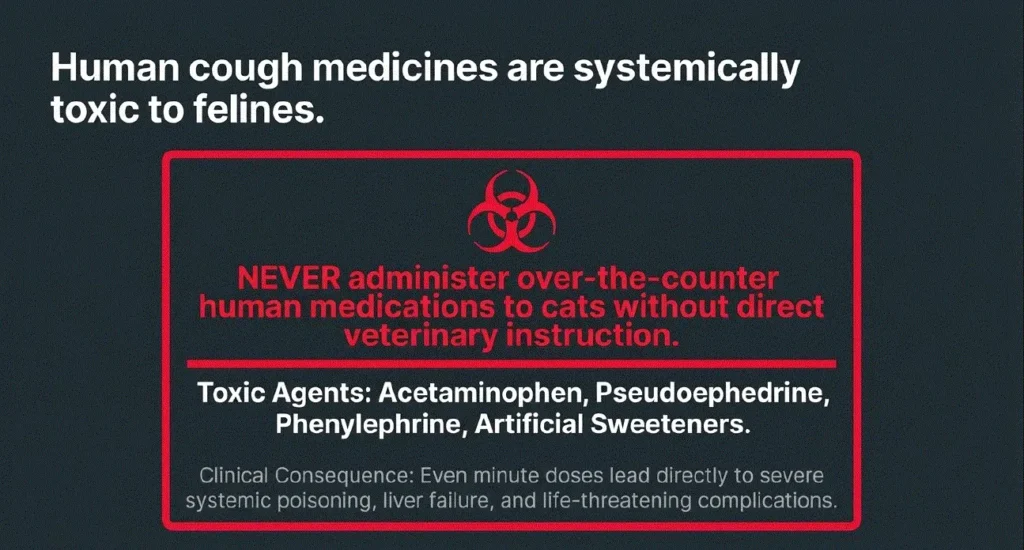 Substances such as acetaminophen, pseudoephedrine, phenylephrine, and certain artificial sweeteners can cause severe poisoning in cats. Even small doses may lead to liver failure or other life-threatening complications. Because of these risks, pet owners should never administer human cough medicines without veterinary guidance.