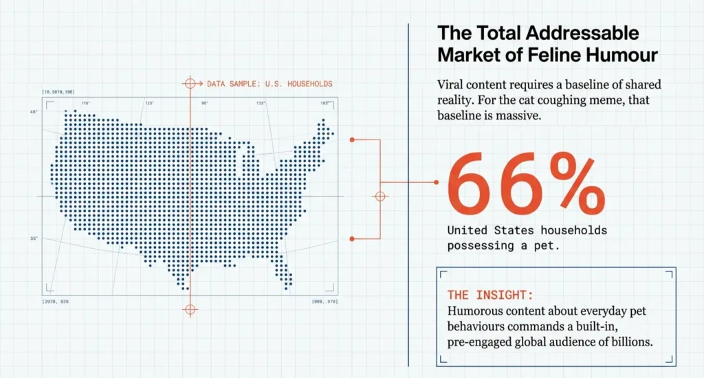 In recent years, memes featuring pets have grown rapidly in popularity. According to research from the American Pet Products Association, nearly 66% of households in the United States own a pet, with cats representing a large portion of these pets.