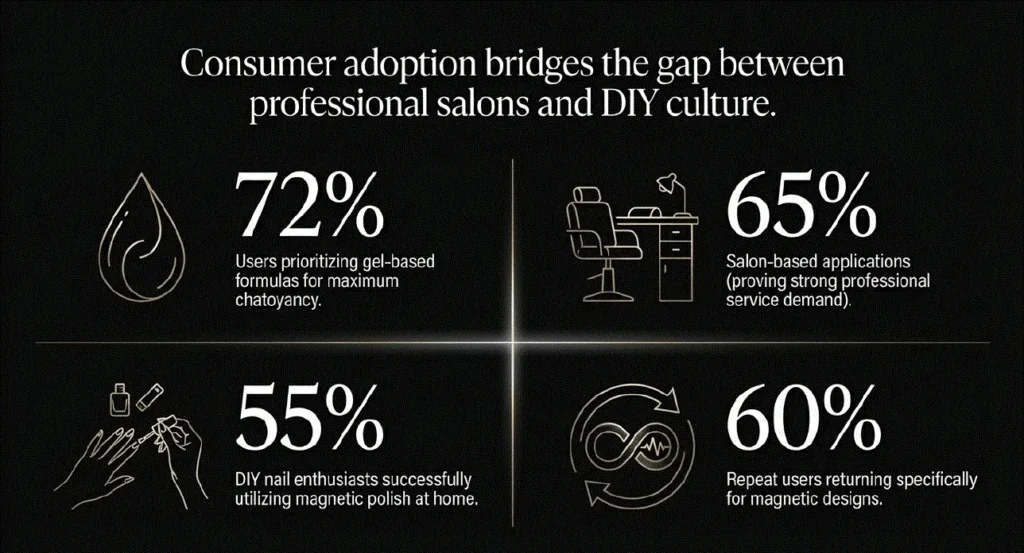 Additionally, search demand for “cat eye gel polish” reached peak interest levels of 91 (normalized scale) in late 2025, indicating strong global demand.