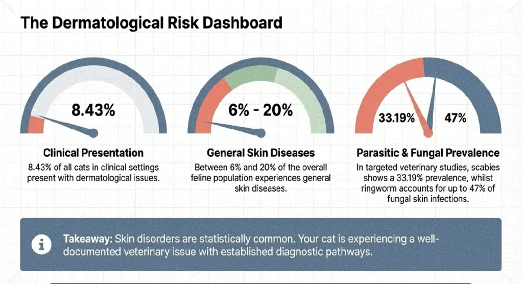 A veterinary study reported 33.19% prevalence of scabies in examined cats, highlighting how common parasitic skin issues can be.