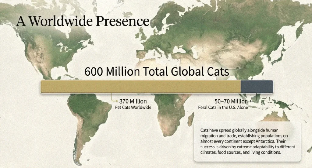 Research shows that the domestic cat (Felis catus) is one of the most widespread mammals globally, with millions living across urban and rural areas. This adaptability explains why cats are found on almost every continent except Antarctica.