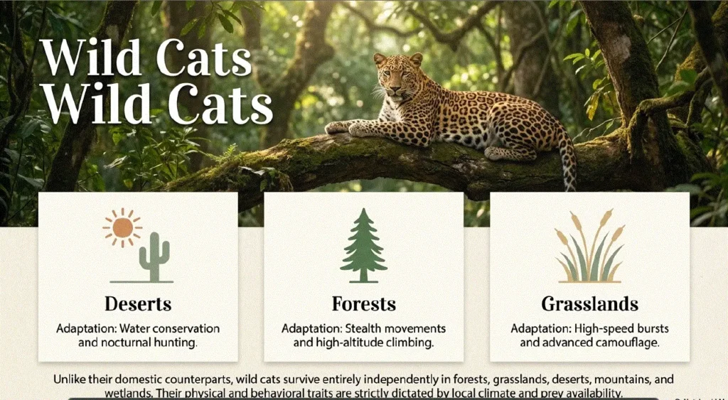 Wild cats (such as lions, tigers, and leopards) adapt to specific ecosystems based on prey availability and climate.